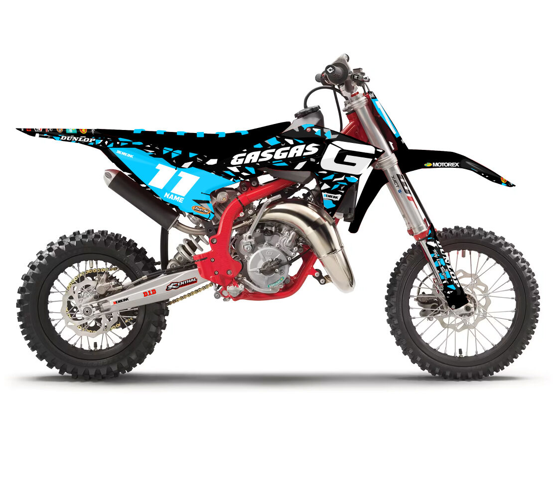 Gas Gas MC50 MC65 MC85 Candy Series Black Light Blue Full Graphics Kit. Custom made with your name & race number. Add your sponsor logos (Optional).