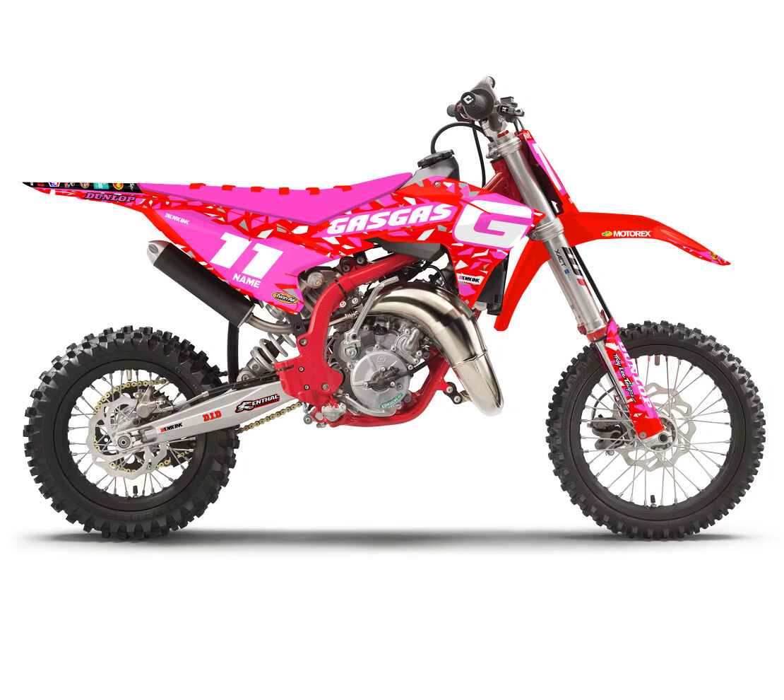 Gas Gas MC50 MC65 MC85 Candy Series Pink Full Graphics Kit. Custom made with your name & race number. Add your sponsor logos (Optional).