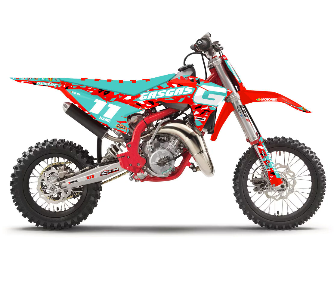 Gas Gas MC50 MC65 MC85 Candy Series Teal Full Graphics Kit. Custom made with your name & race number. Add your sponsor logos (Optional).