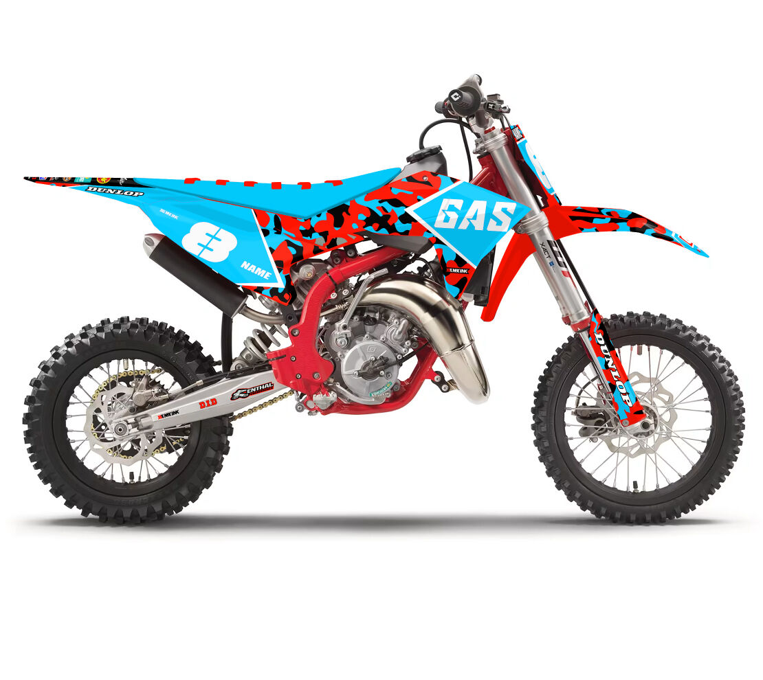 Gas Gas MC50 MC65 MC85 Concealed Series Light Blue Full Graphics Kit. Custom made with your name & race number. Add your sponsor logos (Optional).