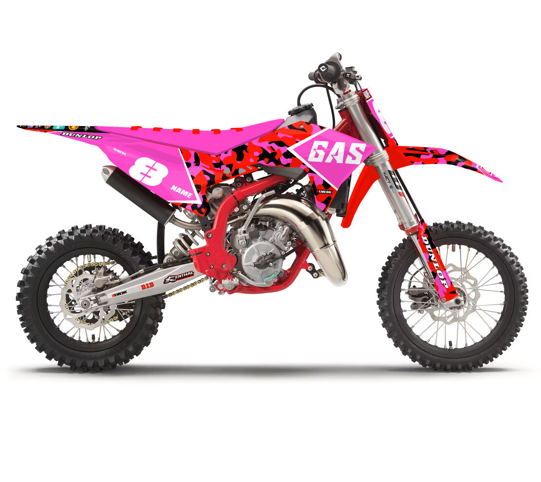 Gas Gas MC50 MC65 MC85 Concealed Series Pink Full Graphics Kit. Custom made with your name & race number. Add your sponsor logos (Optional).