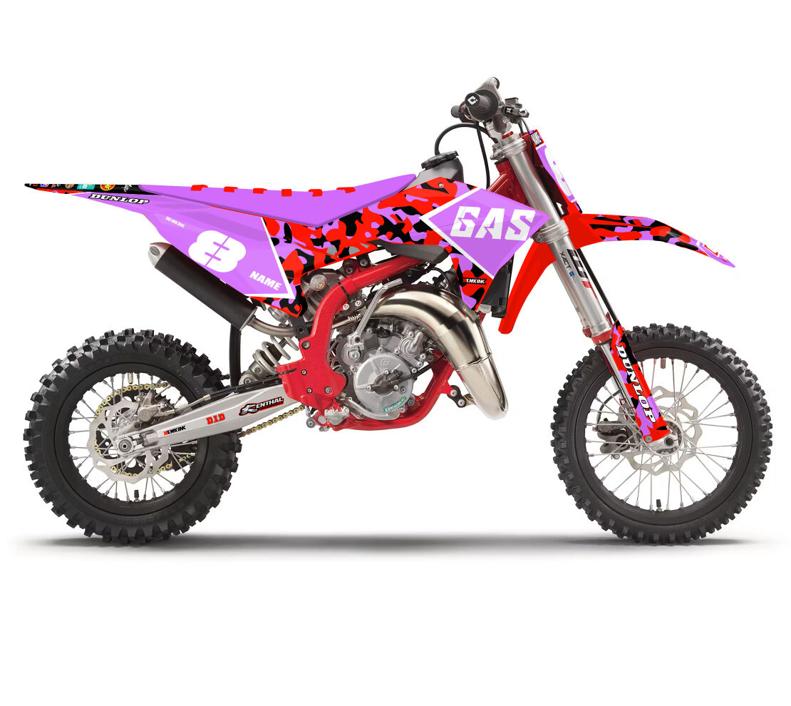 Gas Gas MC50 MC65 MC85 Concealed Series Purple Full Graphics Kit. Custom made with your name & race number. Add your sponsor logos (Optional).