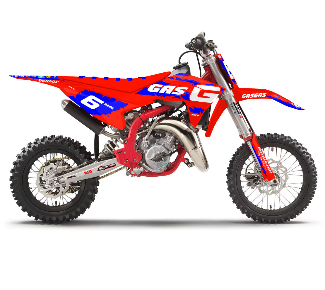 Gas Gas MC50 MC65 MC85 Destroyed Series Blue Full Graphics Kit. Custom made with your name & race number. Add your sponsor logos (Optional).