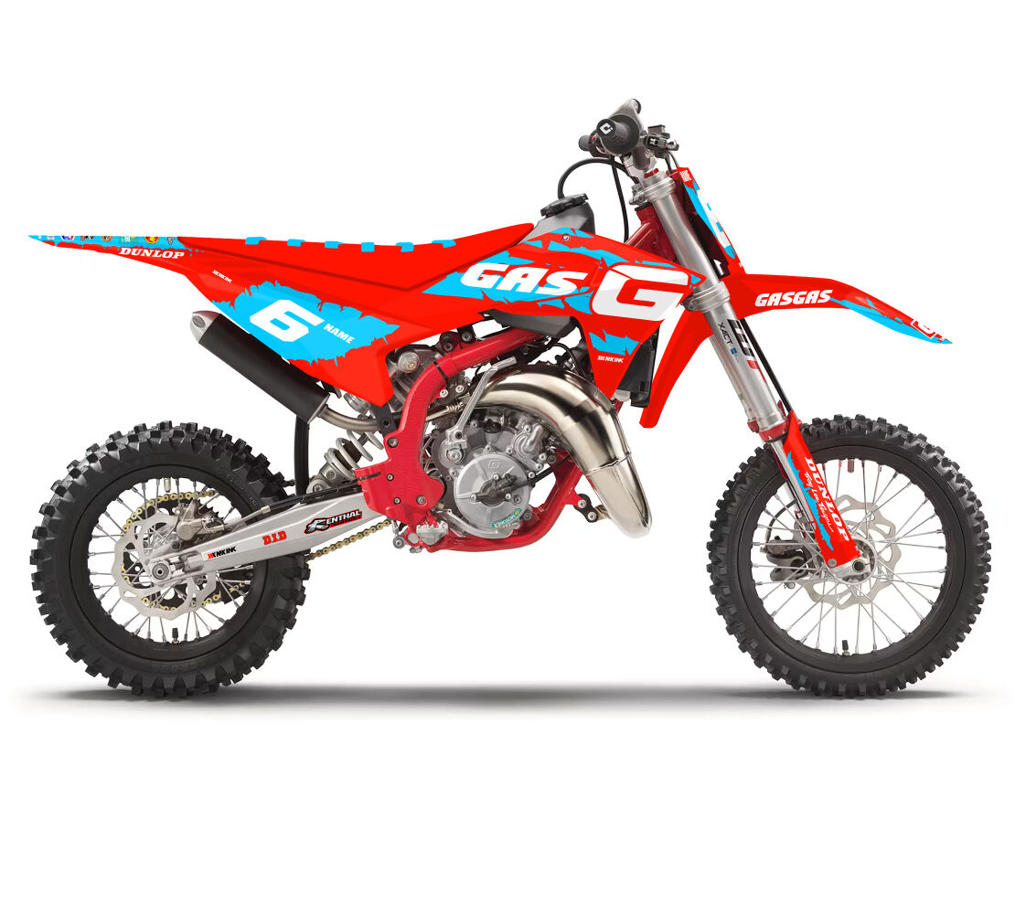 Gas Gas MC50 MC65 MC85 Destroyed Series Light Blue Full Graphics Kit. Custom made with your name & race number. Add your sponsor logos (Optional).