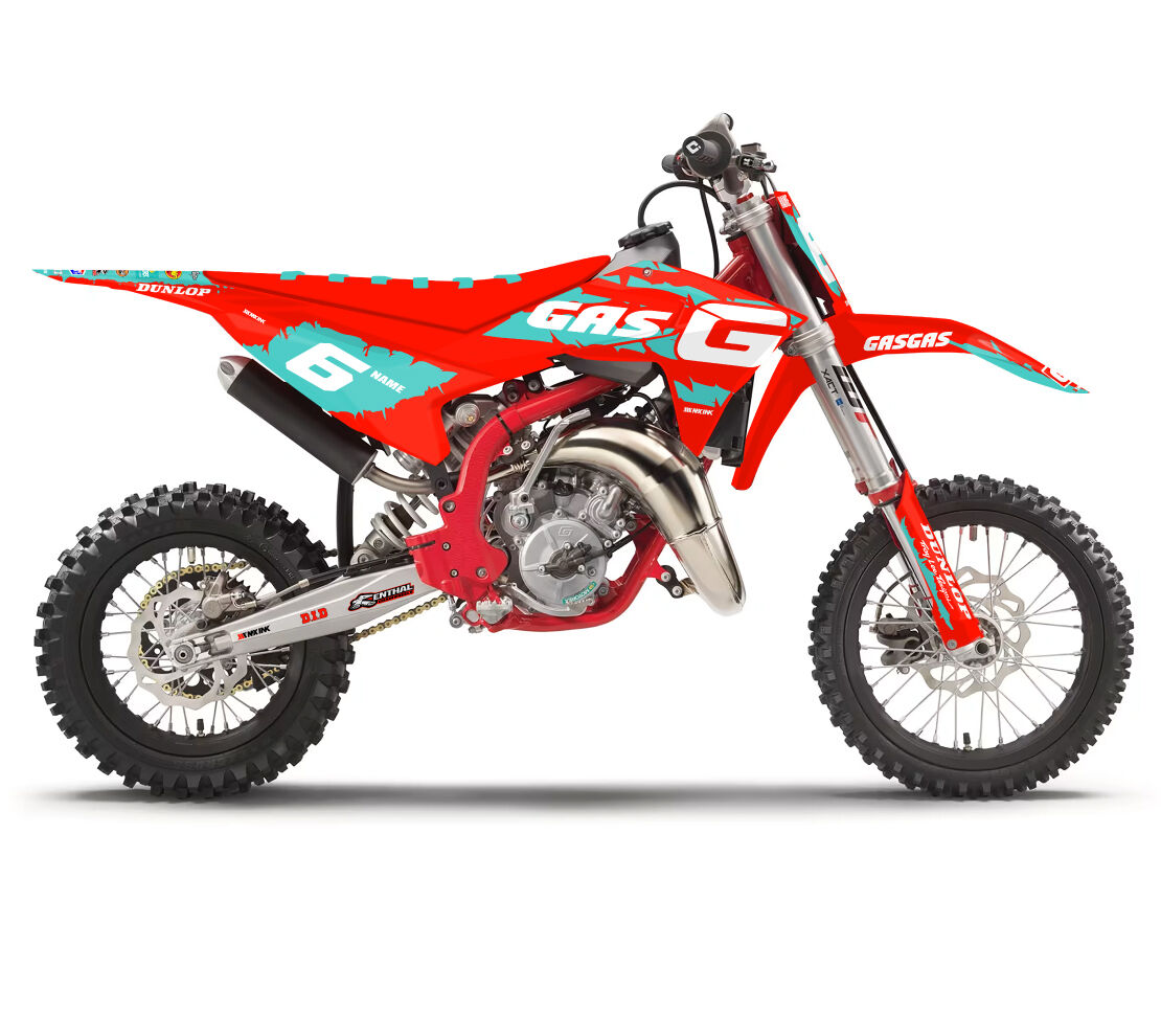Gas Gas MC50 MC65 MC85 Destroyed Series Teal Full Graphics Kit. Custom made with your name & race number. Add your sponsor logos (Optional).