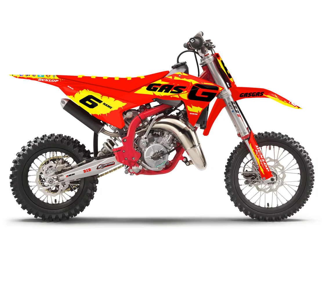 Gas Gas MC50 MC65 MC85 Destroyed Series Yellow Full Graphics Kit. Custom made with your name & race number. Add your sponsor logos (Optional).