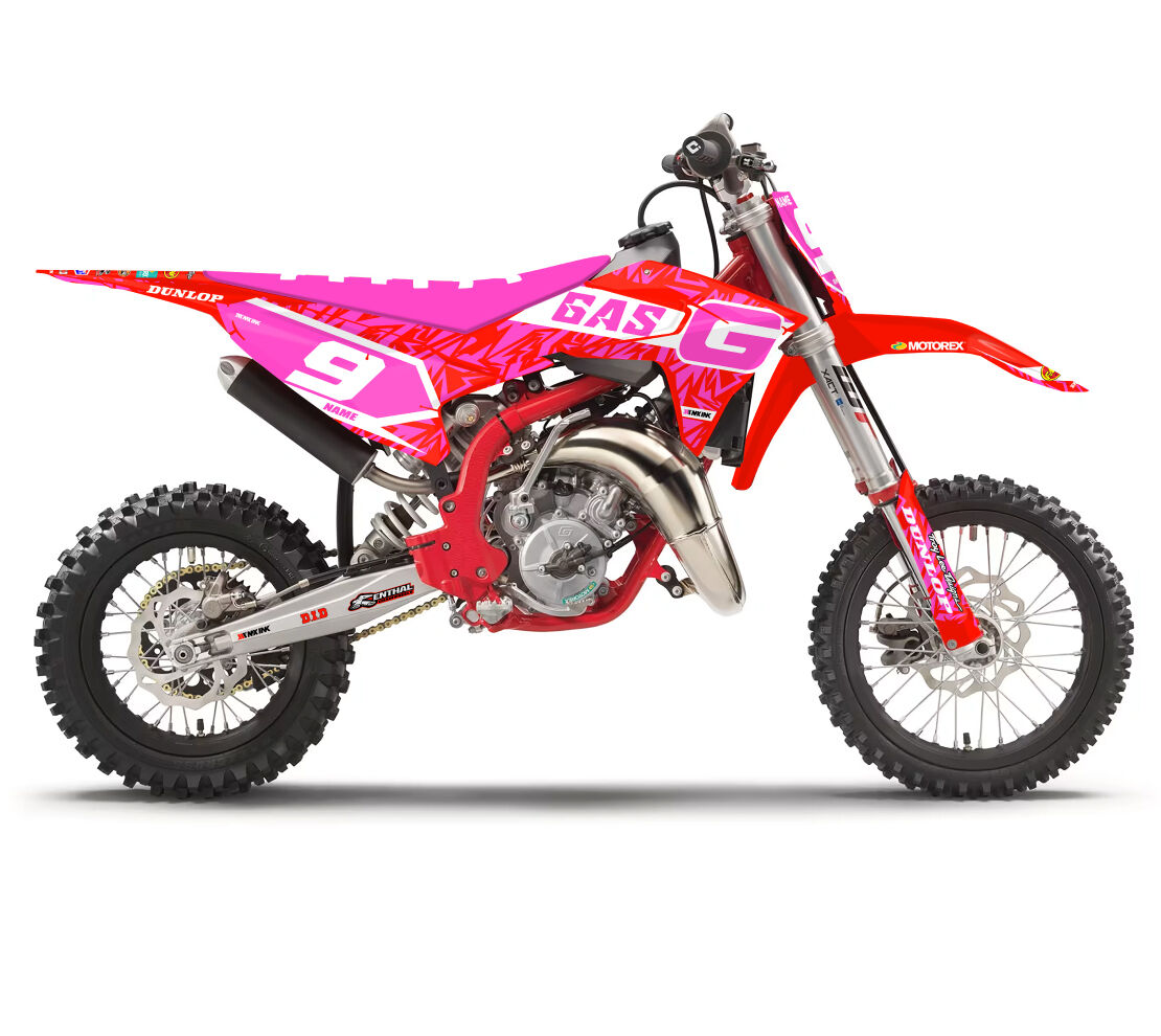Gas Gas MC50 MC65 MC85 Fragment Series Pink Full Graphics Kit. Custom made with your name & race number. Add your sponsor logos (Optional).
