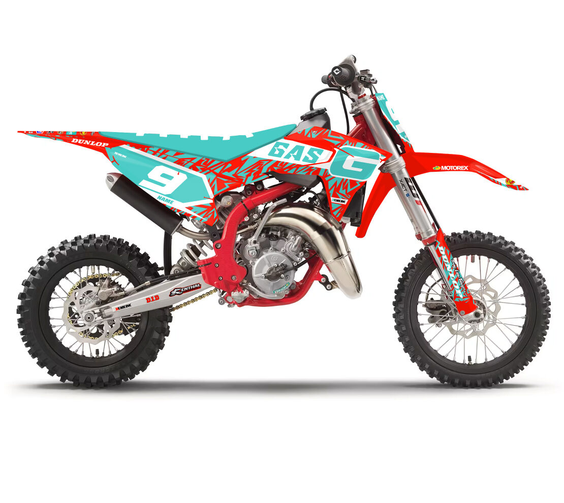 Gas Gas MC50 MC65 MC85 Fragment Series Teal Full Graphics Kit. Custom made with your name & race number. Add your sponsor logos (Optional).