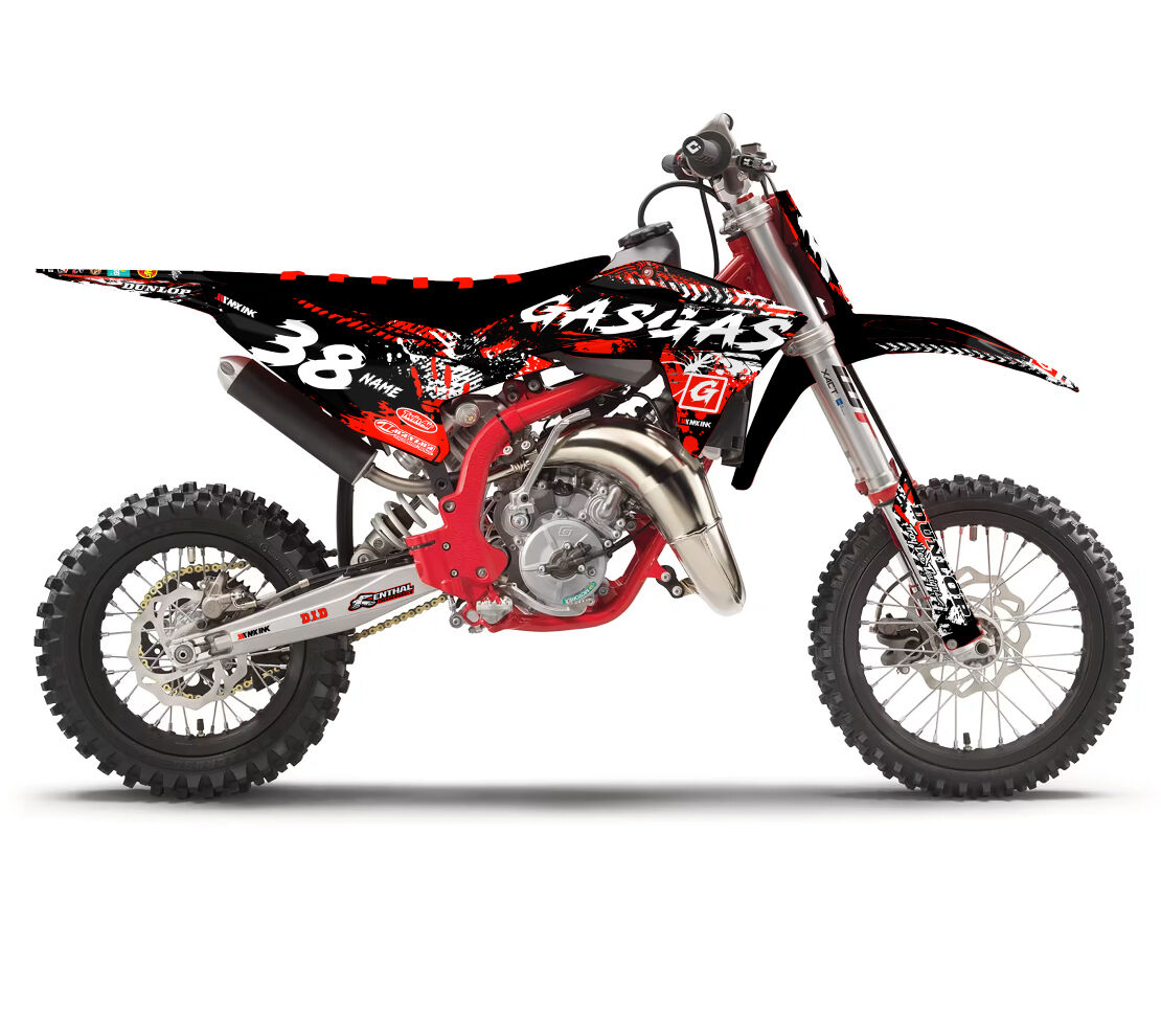 Gas Gas MC50 MC65 MC85 Ghost Series Black Full Graphics Kit. Custom made with your name & race number. Add your sponsor logos (Optional).