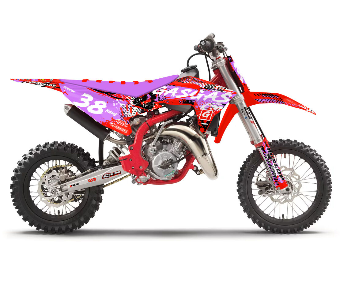 Gas Gas MC50 MC65 MC85 Ghost Series Purple Full Graphics Kit. Custom made with your name & race number. Add your sponsor logos (Optional).