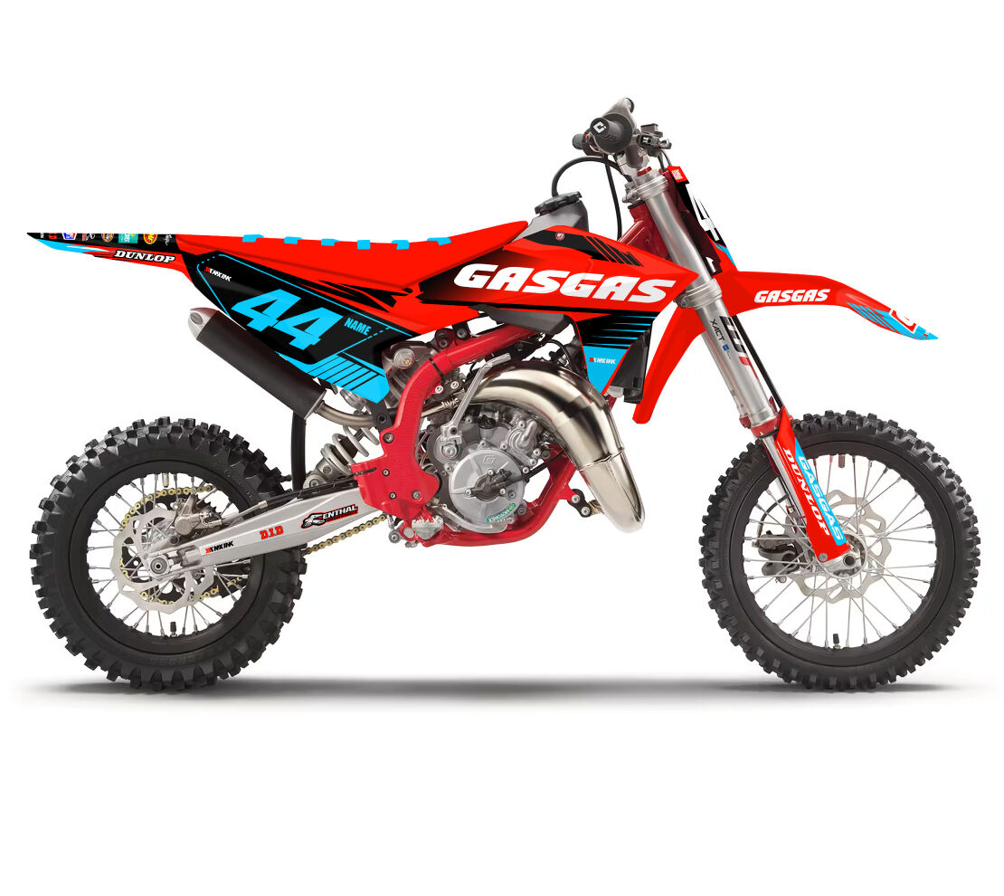 Gas Gas MC50 MC65 MC85 Momentum Series Light Blue Full Graphics Kit. Custom made with your name & race number. Add your sponsor logos (Optional).
