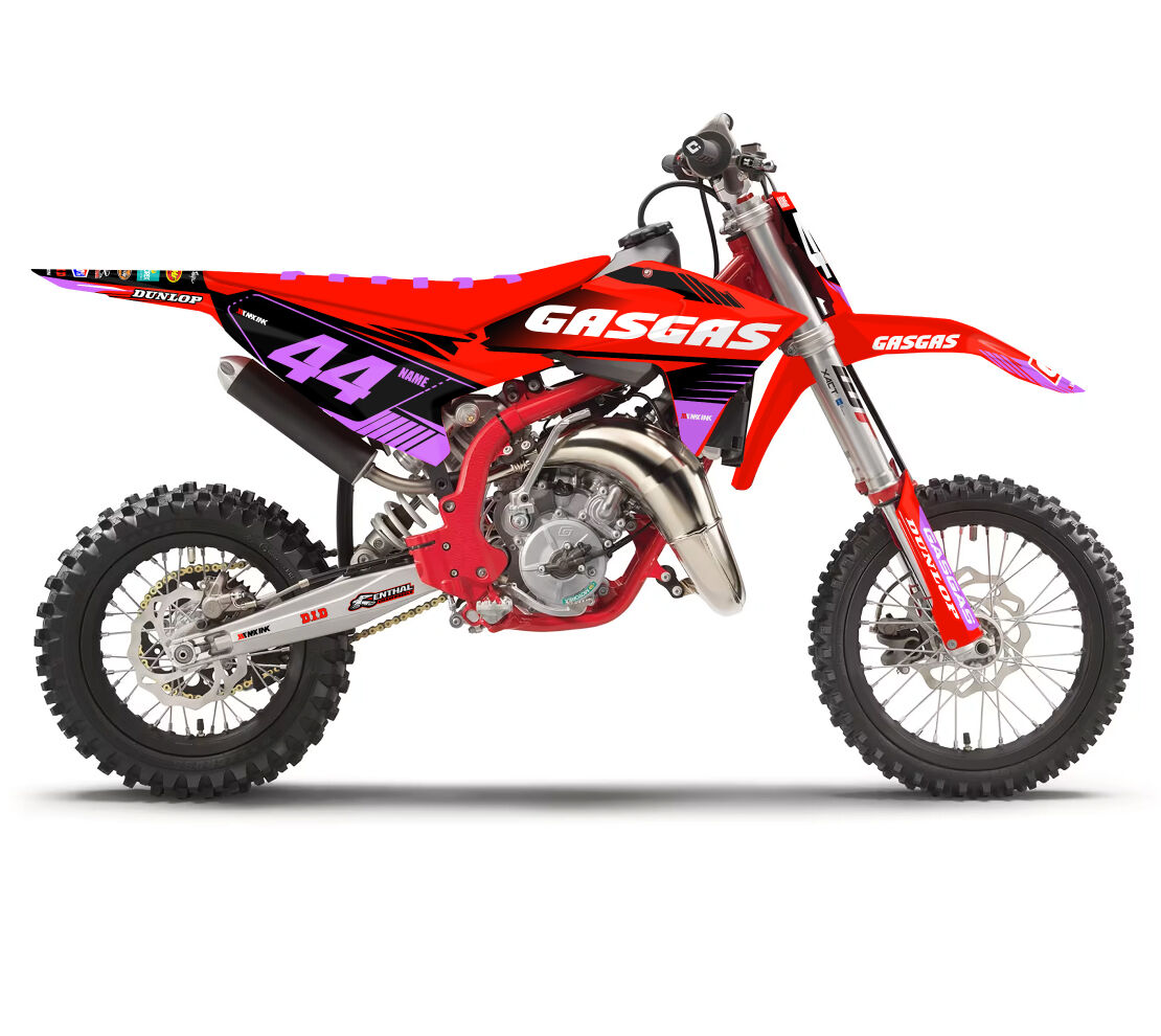 Gas Gas MC50 MC65 MC85 Momentum Series Purple Full Graphics Kit. Custom made with your name & race number. Add your sponsor logos (Optional).