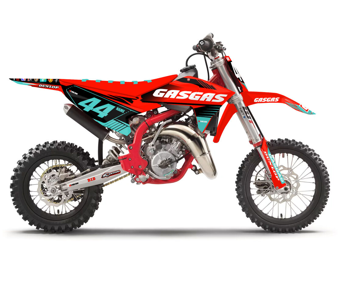 Gas Gas MC50 MC65 MC85 Momentum Series Teal Full Graphics Kit. Custom made with your name & race number. Add your sponsor logos (Optional).