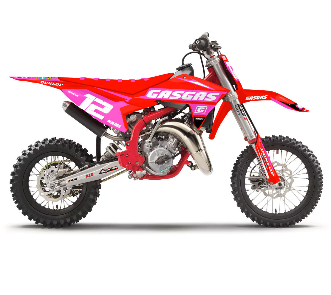 Gas Gas MC50 MC65 MC85 Pulse Series Pink Full Graphics Kit. Custom made with your name & race number. Add your sponsor logos (Optional).