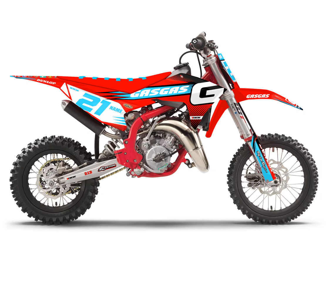 Gas Gas MC50 MC65 MC85 Radiate Series Light Blue Full Graphics Kit. Custom made with your name & race number. Add your sponsor logos (Optional).