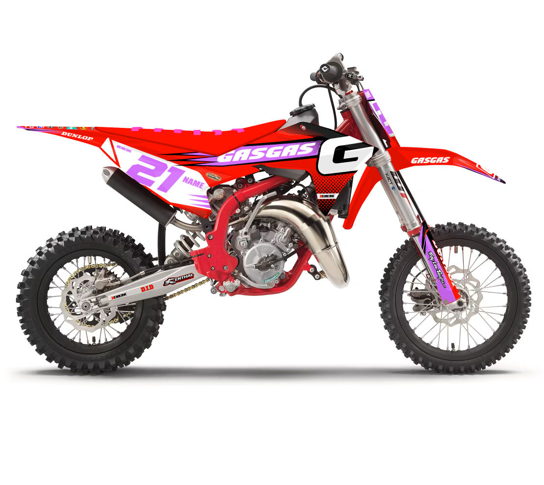 Gas Gas MC50 MC65 MC85 Radiate Series Purple Full Graphics Kit. Custom made with your name & race number. Add your sponsor logos (Optional).