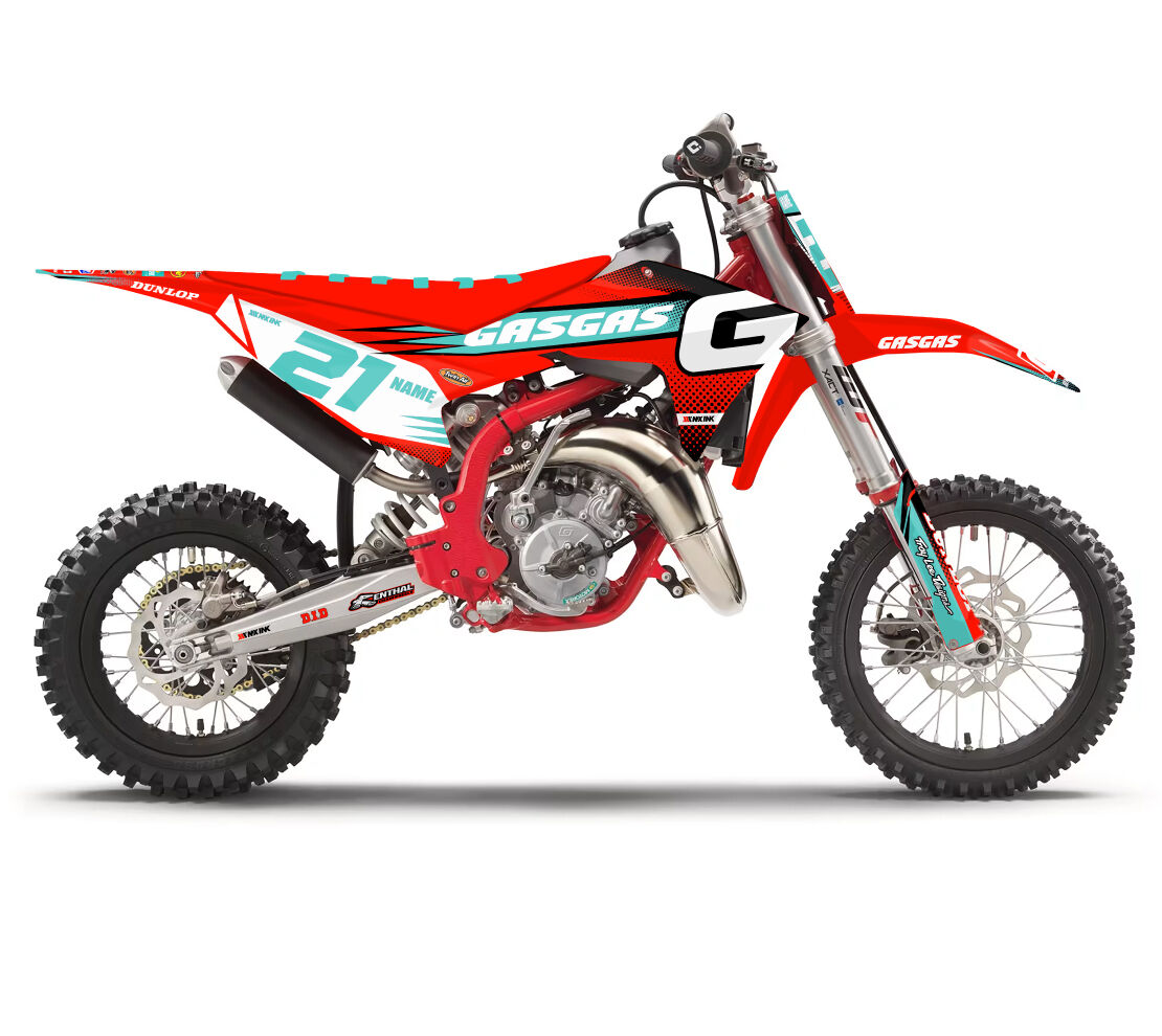 Gas Gas MC50 MC65 MC85 Radiate Series Teal Full Graphics Kit. Custom made with your name & race number. Add your sponsor logos (Optional).