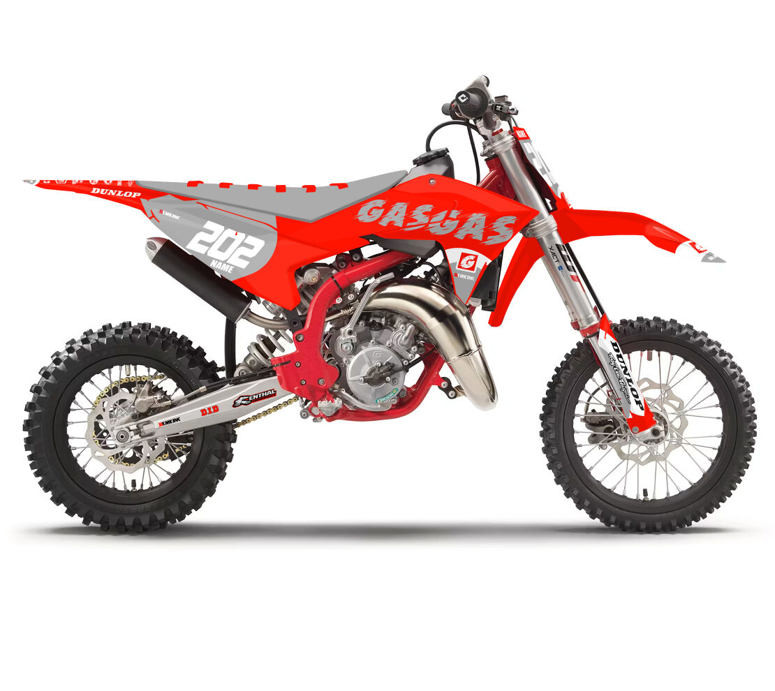 Gas Gas MC50 MC65 MC85 Rush Grey Series Full Graphics Kit. Custom made with your name & race number. Add your sponsor logos (Optional).