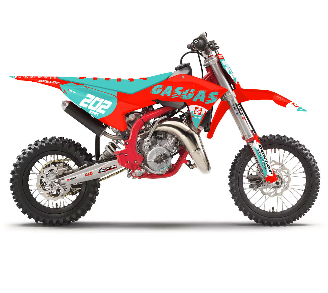 Gas Gas MC50 MC65 MC85 Rush Teal Series Full Graphics Kit. Custom made with your name & race number. Add your sponsor logos (Optional).