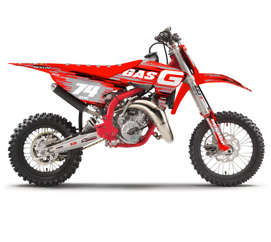 Gas Gas MC50 MC65 MC85 Shred Series Grey Full Graphics Kit. Custom made with your name & race number. Add your sponsor logos (Optional).