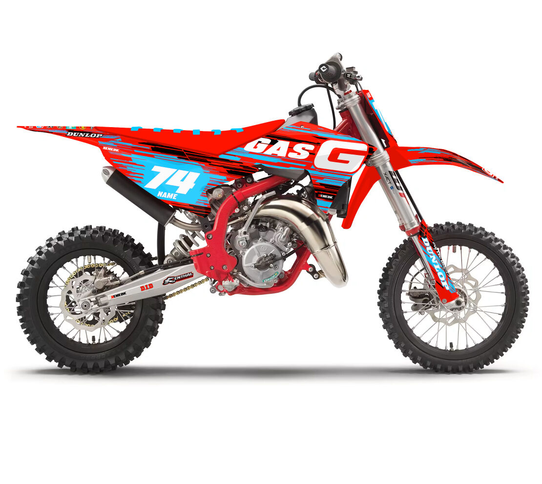 Gas Gas MC50 MC65 MC85 Shred Series Light Blue Full Graphics Kit. Custom made with your name & race number. Add your sponsor logos (Optional).