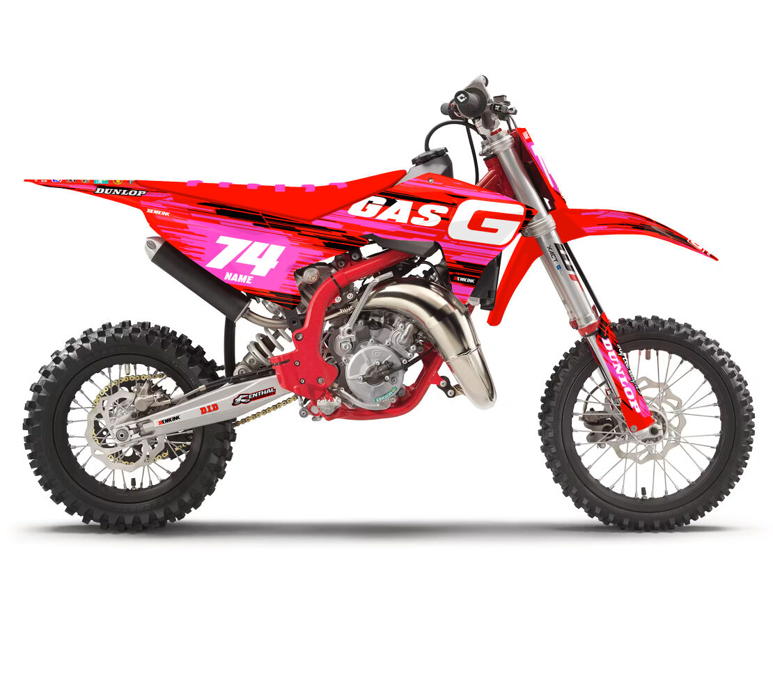 Gas Gas MC50 MC65 MC85 Shred Series Pink Full Graphics Kit. Custom made with your name & race number. Add your sponsor logos (Optional).