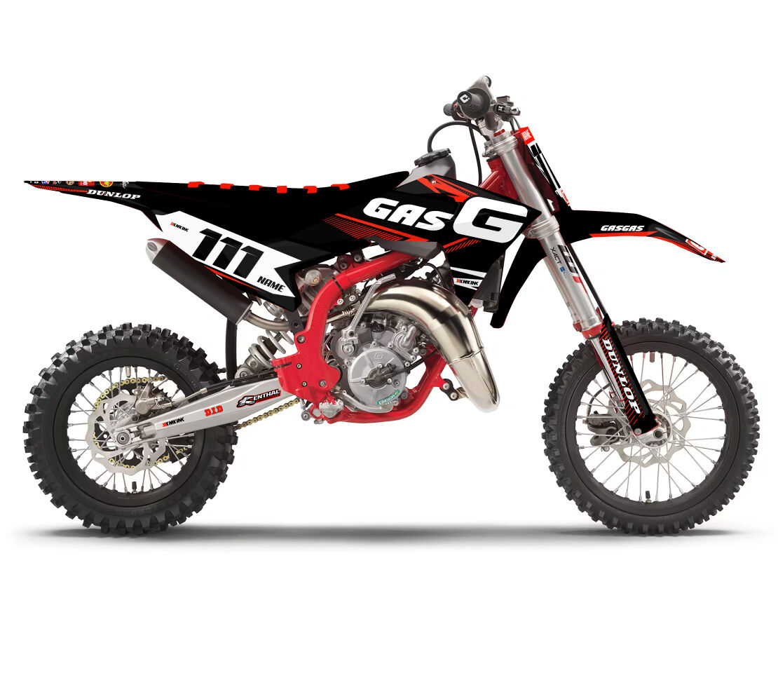 Gas Gas MC50 MC65 MC85 Sonic Series Black Full Graphics Kit. Custom made with your name & race number. Add your sponsor logos (Optional).