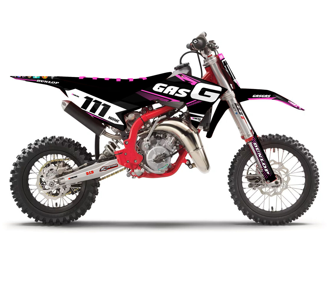 Gas Gas MC50 MC65 MC85 Sonic Series Black Pink Full Graphics Kit. Custom made with your name & race number. Add your sponsor logos (Optional).