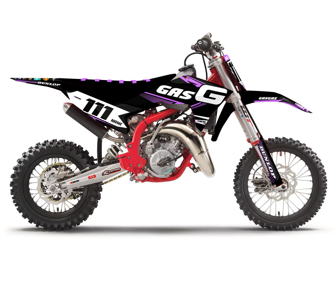 Gas Gas MC50 MC65 MC85 Sonic Series Black Purple Full Graphics Kit. Custom made with your name & race number. Add your sponsor logos (Optional).