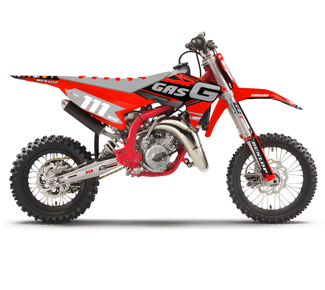 Gas Gas MC50 MC65 MC85 Sonic Series Grey Full Graphics Kit. Custom made with your name & race number. Add your sponsor logos (Optional).