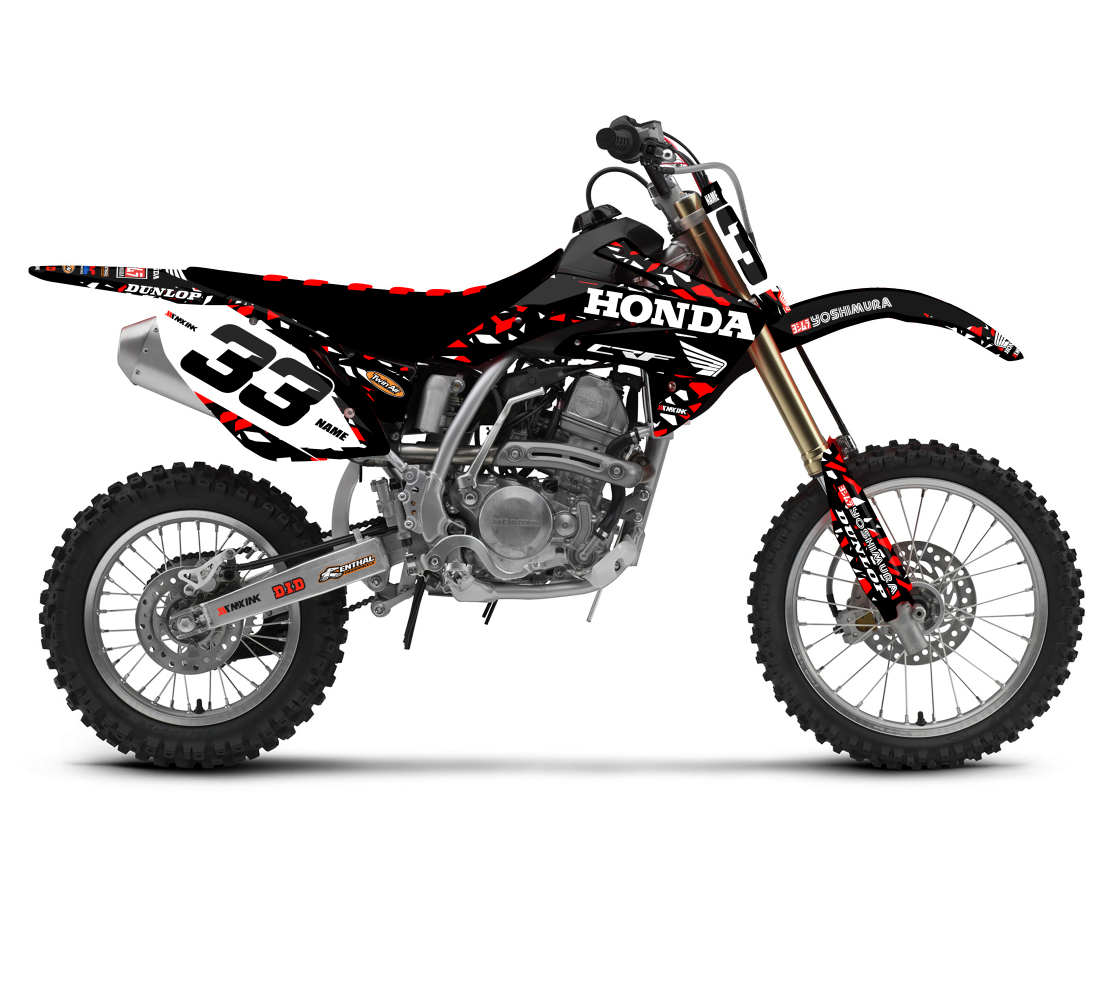 Honda CRF150R Candy Black Series Full Graphics Kit. Custom made with your name & race number. Add your sponsor logos (Optional).