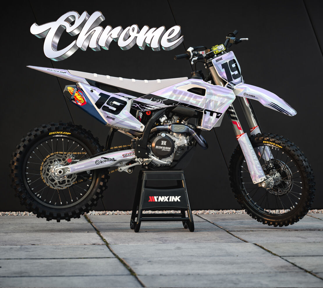 Awakening Grey Series Full CHROME Graphics Kit. Custom made with your name & race number. Add your sponsor logos (Optional).