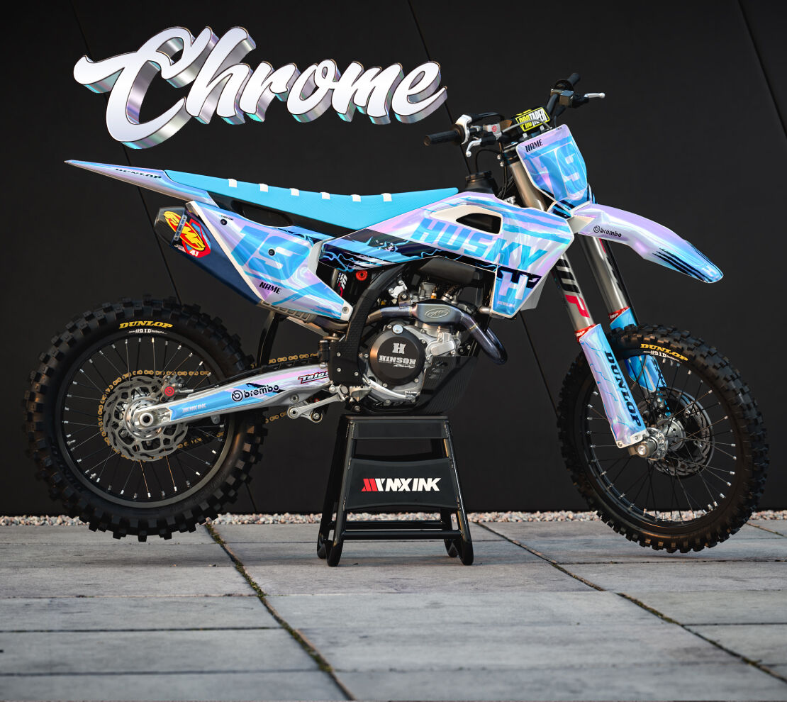 Awakening Light Blue Series Full CHROME Graphics Kit. Custom made with your name & race number. Add your sponsor logos (Optional).