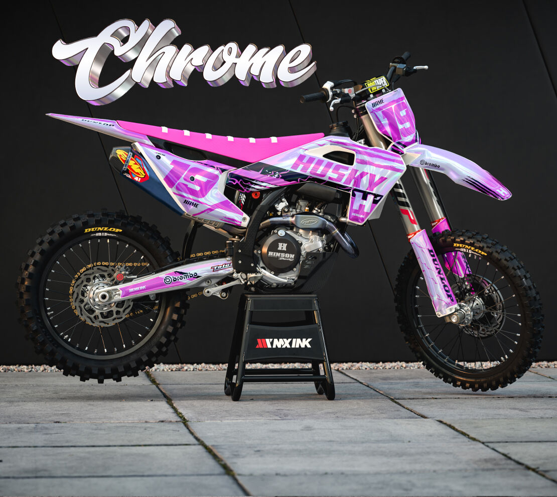 Awakening Pink Series Full CHROME Graphics Kit. Custom made with your name & race number. Add your sponsor logos (Optional).