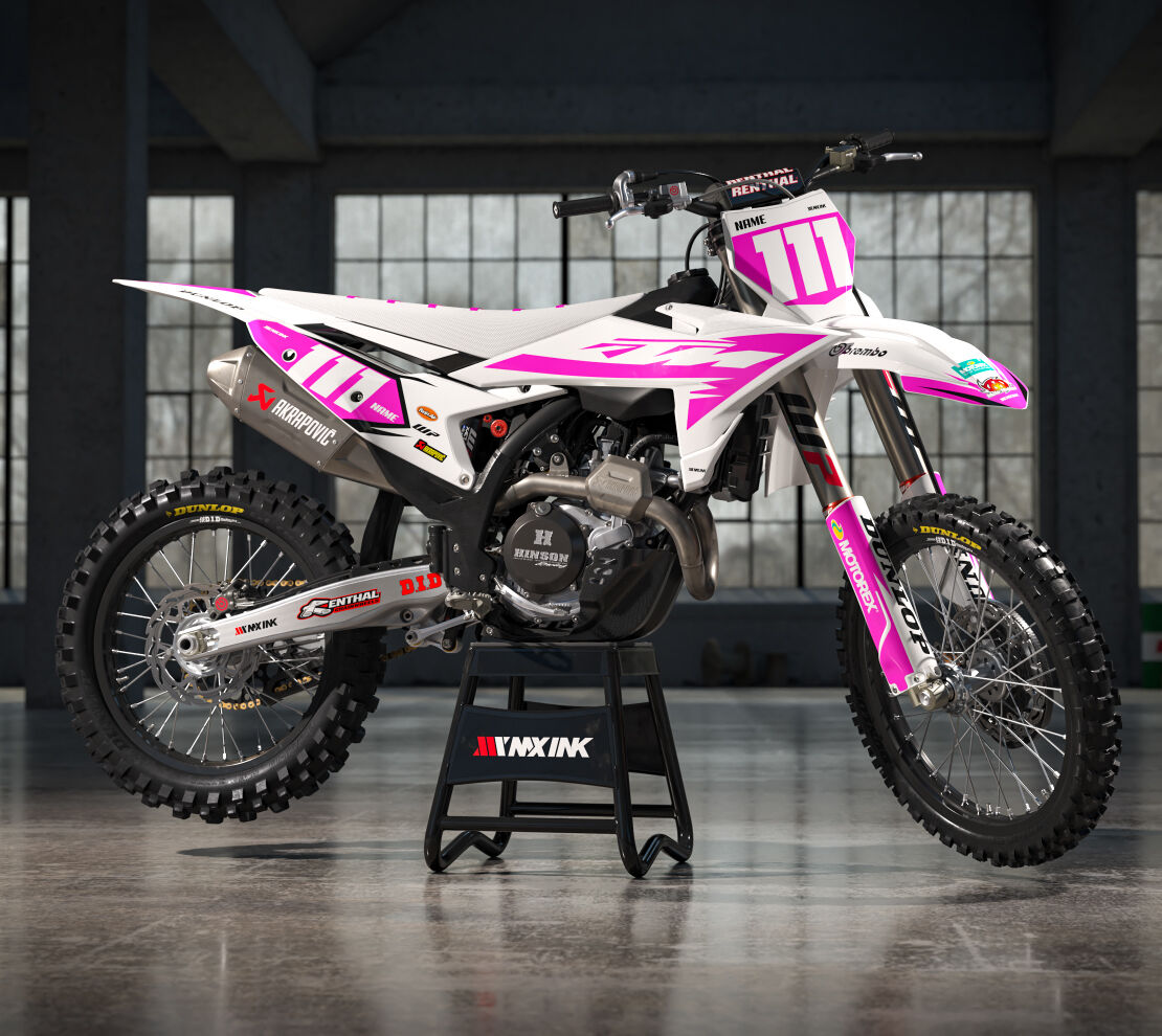 Alert White Pink Series Full Graphics Kit. Custom made with your name & race number. Add your sponsor logos (Optional).