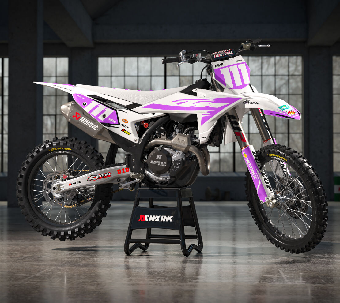 Alert White Purple Series Full Graphics Kit. Custom made with your name & race number. Add your sponsor logos (Optional).