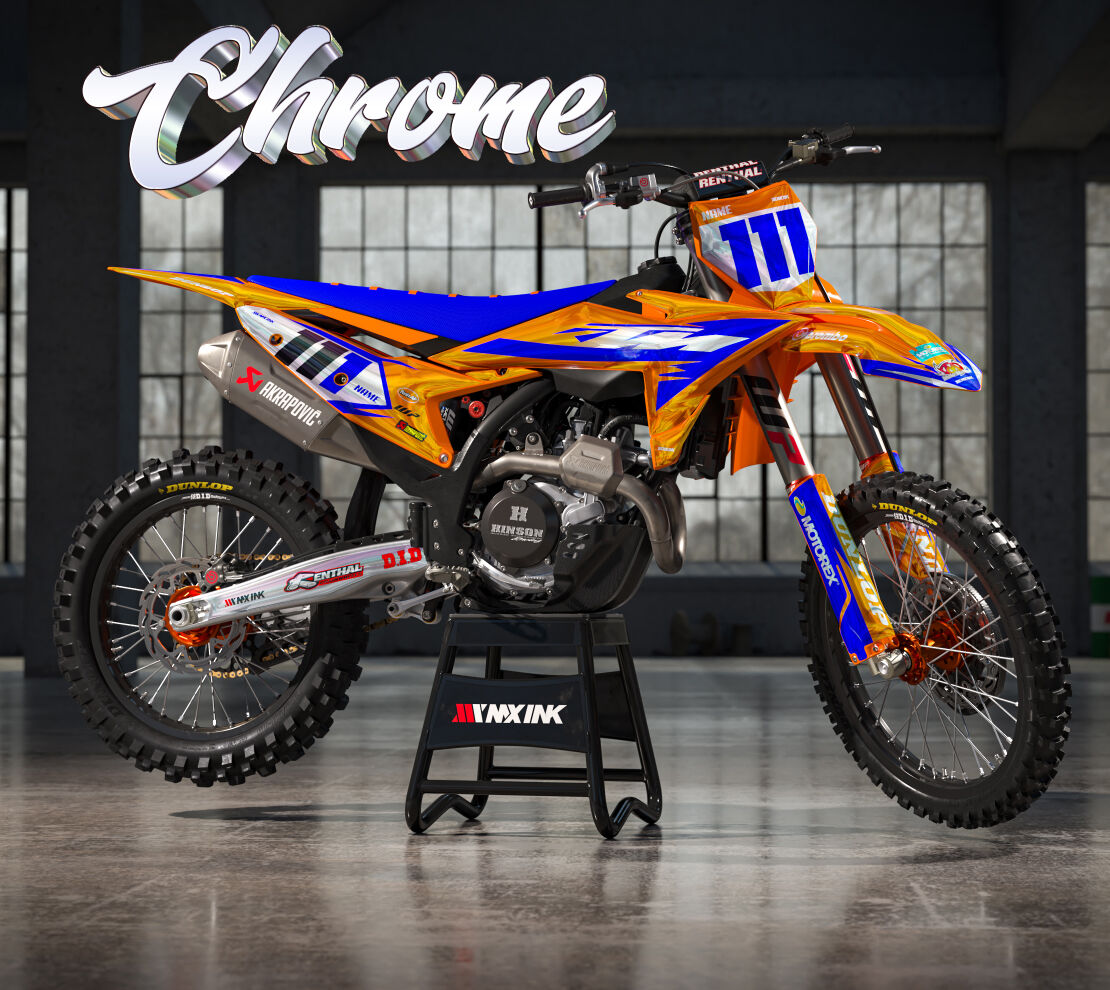 Alert Blue Series Full CHROME Graphics Kit. Custom made with your name & race number. Add your sponsor logos (Optional).