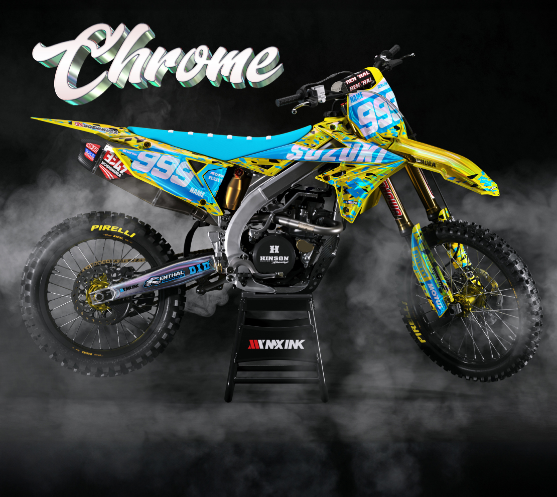 Candy Light Blue Series Full CHROME Graphics Kit. Custom made with your name & race number. Add your sponsor logos (Optional).
