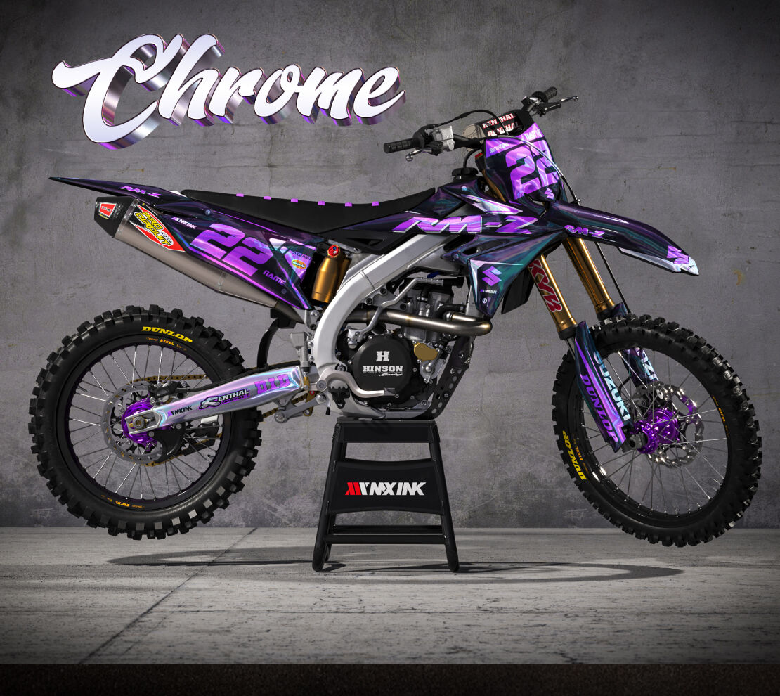 Circuit Black Purple Series Full CHROME Graphics Kit. Custom made with your name & race number. Add your sponsor logos (Optional).
