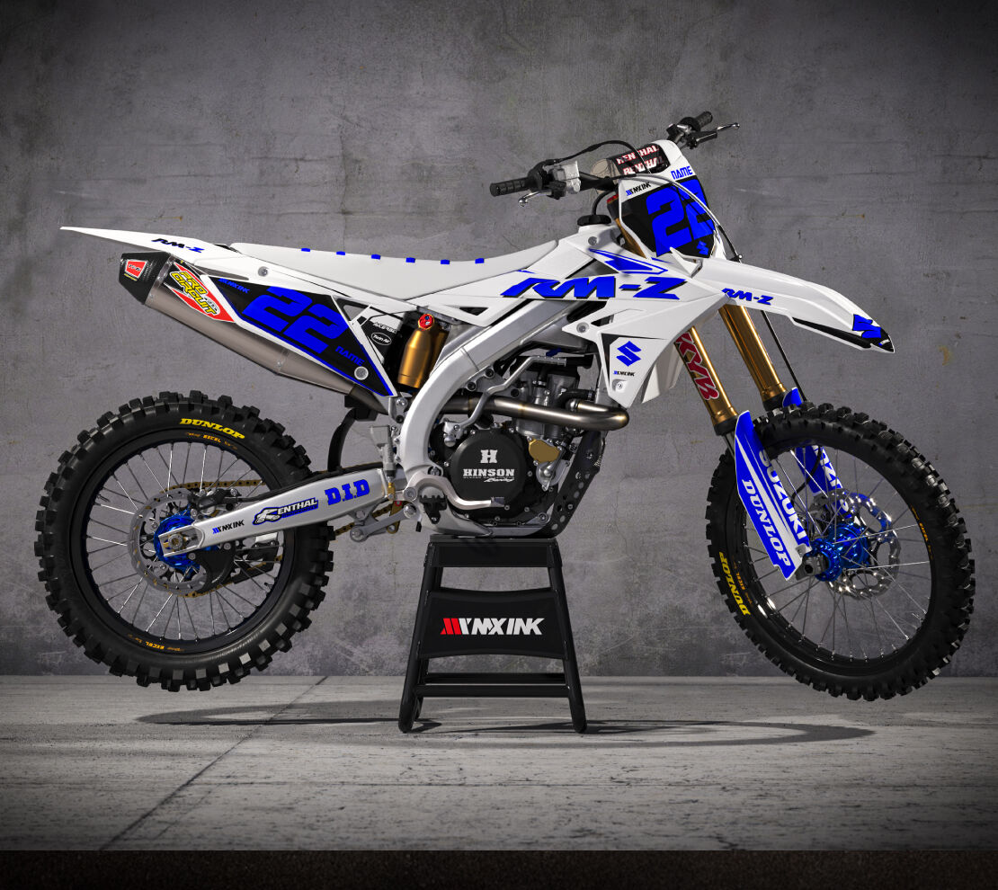 Circuit White Blue Series Full Graphics Kit. Custom made with your name & race number. Add your sponsor logos (Optional).