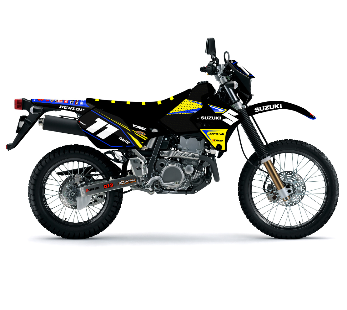 Suzuki Circuit DRZ400 Black Series Full Graphics Kit. Custom made with your name & race number. Add your sponsor logos (Optional).